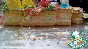 Прежде чем разрезать бисквит на коржи нужно замотать пищевой пленкой и убрать в холодильник минимум на 4 часа. За это время бисквит выстоится и станет более влажным. При нарезке бисквит будет меньше крошиться. (рецепт без фото не сохранялся, пришлось взять фото от такого же торта, только круглого) -
