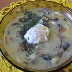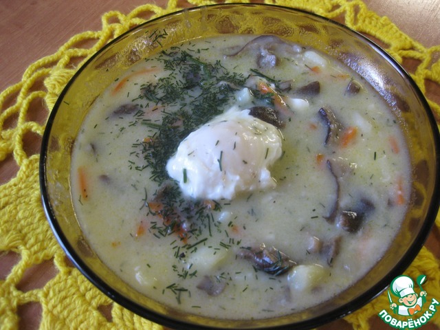 Ароматная южно-чешская грибная кулайда готова! Разлить её по порционным тарелкам, так, чтобы в каждой было яйцо. И здесь нужно сказать, что это — самая сложная операция в процессе приготовления этого супа, ибо выловить в непрозрачном густом супе яйцо всмятку не очень легко. Посыпать укропчиком.