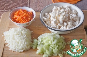 Картофель, морковь, лук и чеснок очистить. Картофель нарезать небольшими кубиками, лук - полукольцами, морковь нашинковать соломкой, чеснок измельчить. Сельдерей и цветную капусту вымыть. Сельдерей нарезать тонкими ломтиками, капусту разобрать на небольшие соцветия. -
