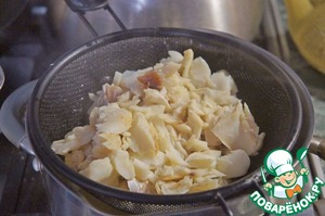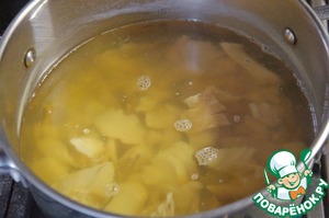 В кастрюле довести до кипения бульон, положить треску и варить после закипания 3 минуты.
