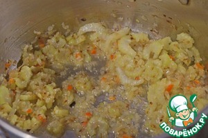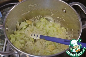 Разогреть в чистой кастрюле масло и обжарить на среднем огне лук, чеснок и сельдерей, время от времени помешивая, 5 минут.