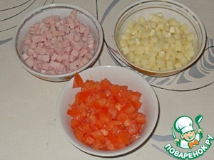 Ветчину, сыр (лучше взять такой, который хорошо плавится: сулугуни, моцареллу) и помидор нарезать маленькими кубиками. -