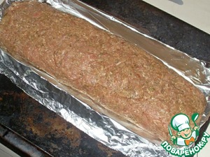 При помощи пленки края фарша поднять над начинкой, соединить и хорошо защипать. Кусок фольги смазать растительным маслом и аккуратно перекатить на неё рулет. Завернуть края фольги наружу в виде бортиков. Поставить рулет в разогретую до 200*С духовку, температуру снизить до 170*С. Запекать 45 минут.