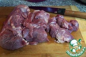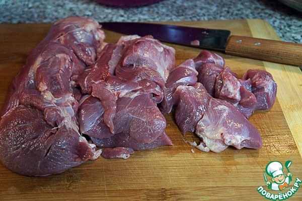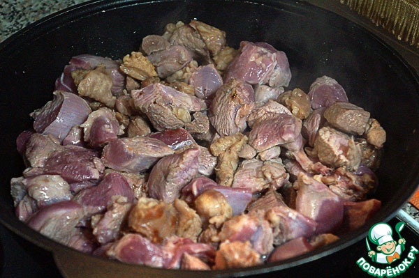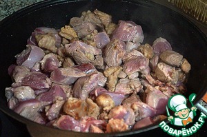 Индейку сначала слегка обжарить на сковородке, переложить в казан или кастрюлю.