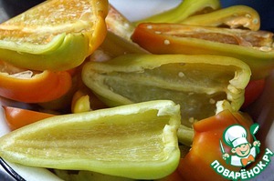 Болгарский перец порезать крупно. Венгерский нарезать полукольцами.