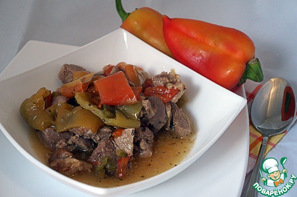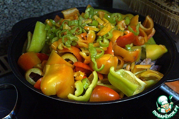 Сверху выложить оба перца, посолить, налить в казан воды или бульона так, чтобы было закрыто примерно две трети объема.