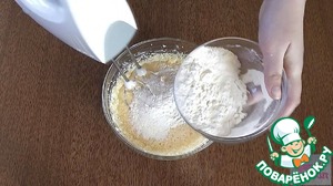 Муку смешать с разрыхлителем и, постепенно добавляя к основной массе, размешивать миксером.