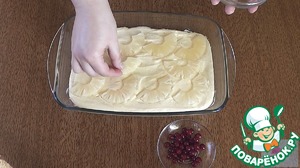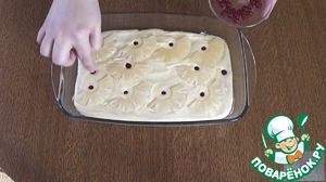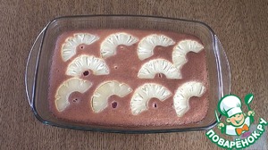 В любом порядке уложить на тесто ананасы, не утапливая их. Иначе, заплывут тестом.