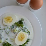 Вареные яйца нарезать и разложить по глубоким тарелкам.