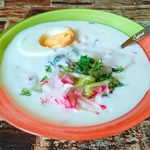 Добавить овощи и зелень, тщательно перемешать и залить кефиром.