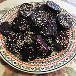 Сложить ломтики свеклы в смазанную маслом емкость для запекания, посолить, поперчить, слегка присыпать мелким сахаром, сбрызнуть растительным маслом и посыпать кунжутом.