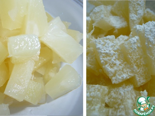 Кусочки ананаса (у меня уже готовые резаные, если у вас кольца, их нужно нарезать небольшими дольками) пересыпать крахмалом.