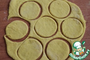 Тесто раскатать в пласт толщиной 5 мм. Вырезать печенье с помощью формочек или стакана.
