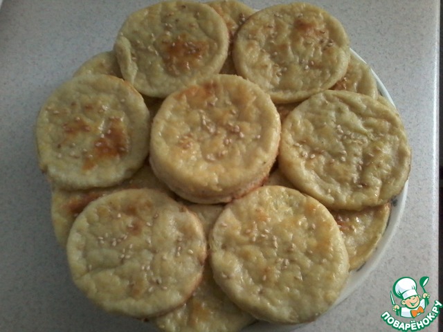 Кунжут подрумянить на сухой сковороде. Печенье смазать желтком, посыпать кунжутом. Печь при 180 градусах 20-25 минут.