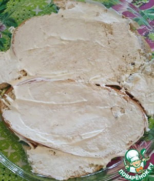 Разрезаем батон вдоль на 3 части, правда у меня одна часть (четвертая) осталась лишней и я ее отложила в сторону. На противень смазанный растительным маслом ( у меня круглый стеклянный), аккуратно размещаем нарезанные куски батона и смазываем их майонезом. Я распределила майонез лопаткой, чтобы он быстрее впитывался.