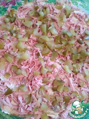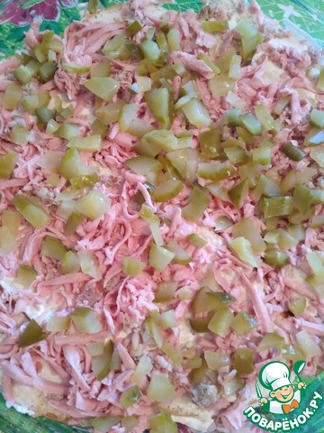 Затем соленый огурчик, нарезанный кубиками. Хотя я больше люблю в пицце свежий, порезанный кольцами помидор, как раз такового не было. Но соленый огурчик придает пикантности пицце, поэтому можете смело его добавлять )