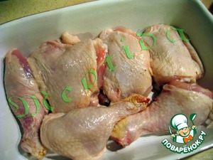 Каждый кусочек курочки моем, обсушиваем, разрезаем на две части и плотно складываем в небольшую форму для выпекания.
