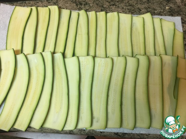 При помощи ножа для сыра нарезать цуккини на тонкие полоски. Можно использовать и обычный нож, но так не получится тонко и аккуратно. Оставить на бумажном полотенце, чтобы впиталась жидкость.
