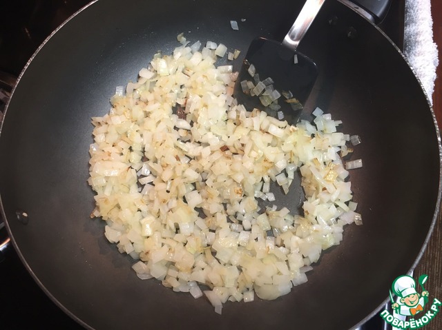 В сковороде обжарить лук до золотистого цвета, добавить измельченный чеснок и обжарить еще пару минут.