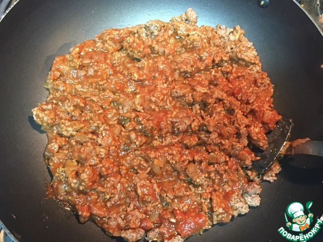 В лук добавить фарш, потушить до готовности и добавить томатной пасты. Как добавите пасту, можно выключать плиту.