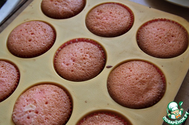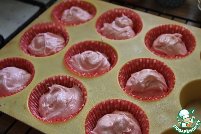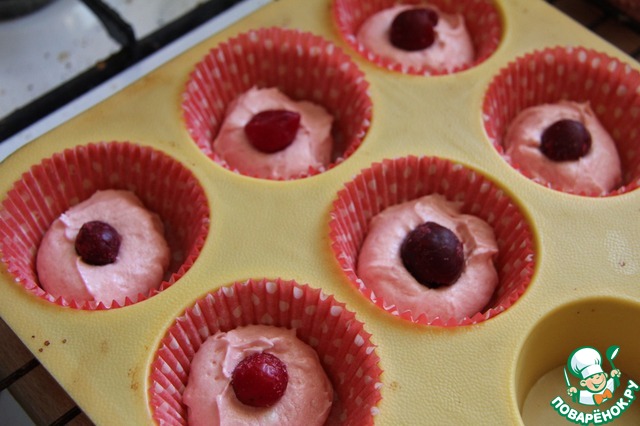 Духовку разогреть до 180 градусов. В форму для кексов вложить бумажные капсулы. Положить немного теста и уложить по вишенке.