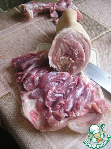 Тщательно выскрести и промыть рульки. Разрезать вдоль и удалить кости, надрезать мышцы вдоль и слегка отбить мякоть.