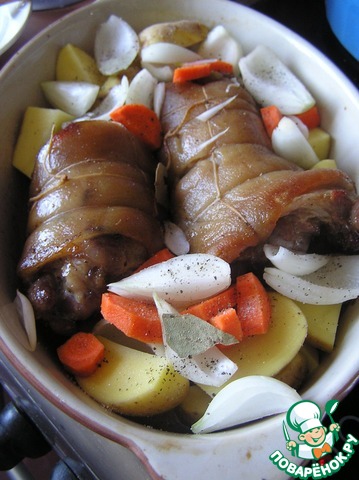 Очистить морковь и лук, молодой картофель тщательно вымыть щеткой. Обсушить овощи и нарезать крупными дольками. Посолить и перемешать. Обложить овощами рульки, присыпать перцем и добавить лаврушку. Влить стакан кипятка.