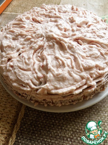 Обильно смазать коржи кремом, покрыть торт и сверху толстым слоем крема.
