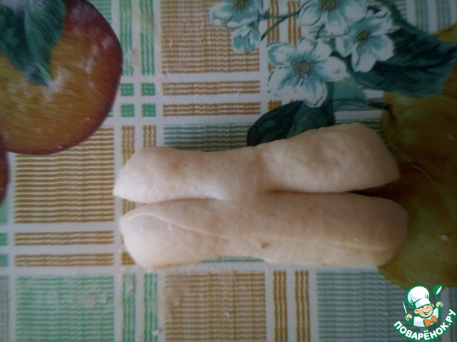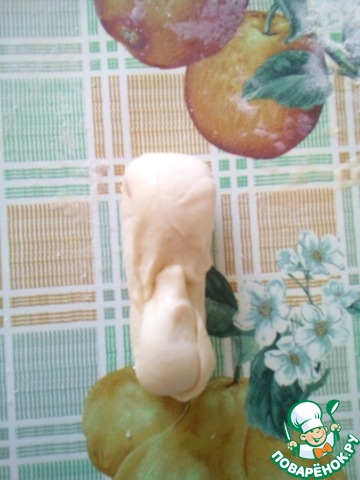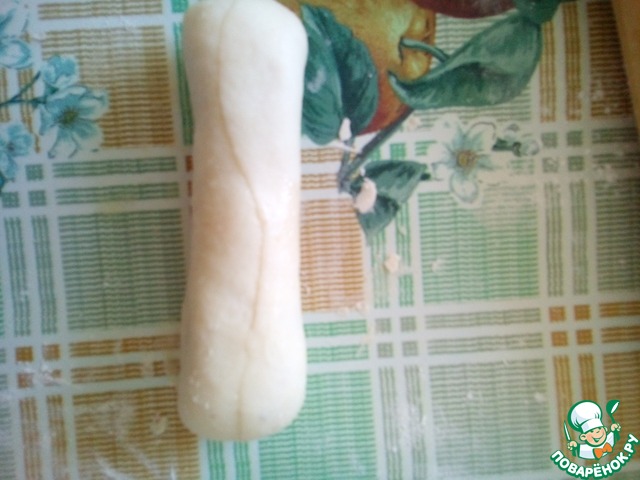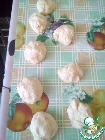 Берем тесто, можно купить или приготовить. Я булочки делала из своего любимого теста, процесс приготовления описан в моих рецептах "Сосиски в тесте". Тесто универсальное, пеку из него сладкую и не сладкую выпечку. Тесто я поделила на 10 одинаковых комочков.