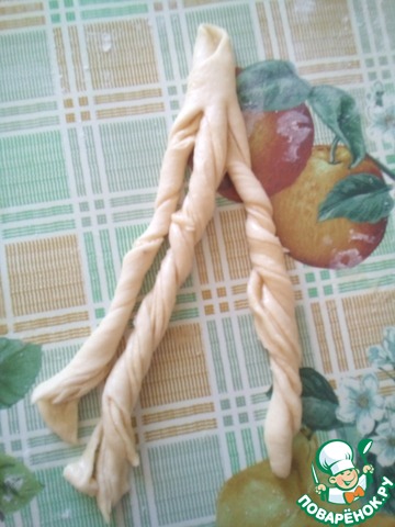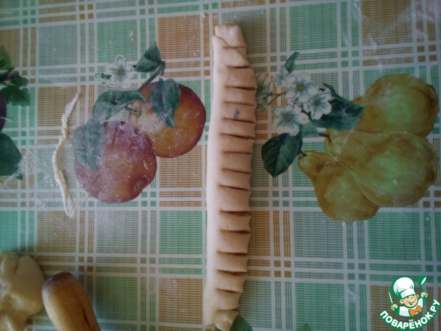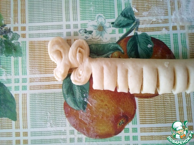 Второй вариант: Берем колобок и повторяем процедуру сворачивания в рулет. Только теперь делаем вот такой разрез.