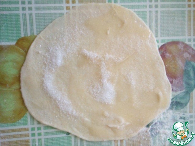 Топим сливочное масло и обмазываем раскатанное тесто. Посыпаем сверху сахаром.