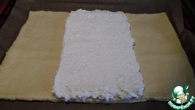 Раскатать тесто толщиной 0,8 - 1 см, выложить на противень, застеленный бумагой для выпечки. Разделить визуально на три сектора. В центр выложить творожную начинку.