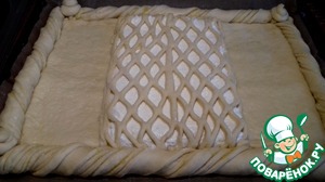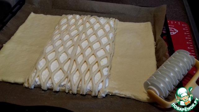 Затем раскатать часть оставшегося теста толщиной 0,5 см, вырезать специальным валиком сеточку, аккуратно выложить ее на творожную начинку, прижать края сеточки. Если такого валика нет, можно сделать сеточку из полосочек теста.