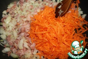 Разогреть сковороду и начинаем обжаривать бекон, затем добавляем лук и морковь. Перчим по вкусу.