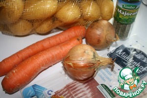 Картофель почистить и мелко порезать. Лук нарезать мелким кубиком, морковь потереть. Бекон так же мелко порезать.