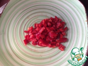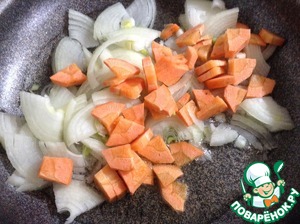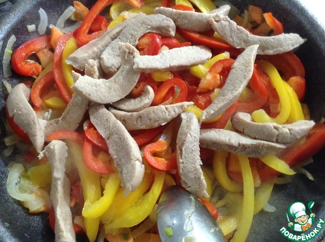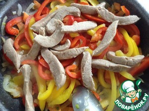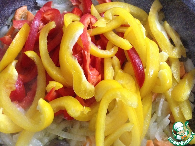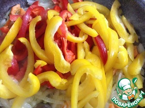 Сладкий перец нарезать дольками и добавить к луку с морковью. Обжариваем на маленьком огне. Овощи должны быть немного сыроваты.