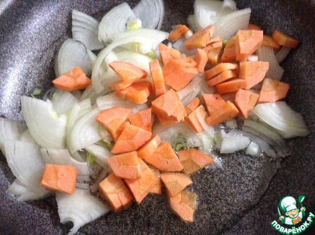 Пока варятся яйца очистить и нарезать луковицу и морковь. Обжарить слегка на оливковом масле.