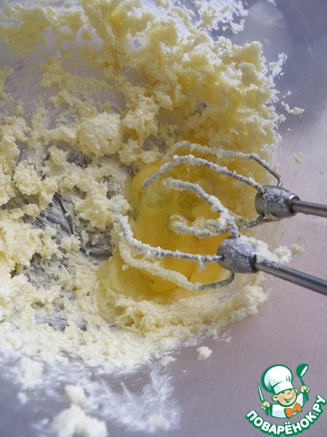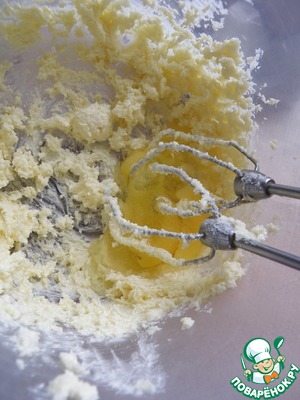 Взбить масло с сахаром добела. Добавить по одному яйца, взбивая после каждого хорошо.