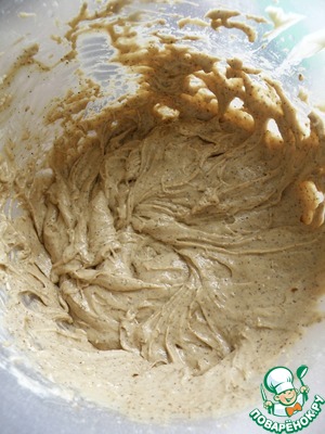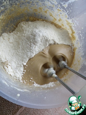 Добавить сгущенный кофе – если нет - просто смешать сгущенку с растворимым кофе по вкусу. Просеять муку с разрыхлителем и на малых оборотах миксера вмешать в масляную смесь.