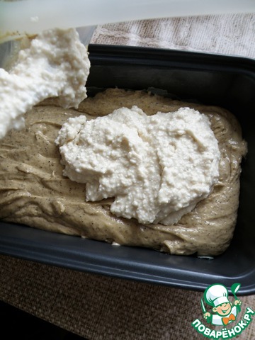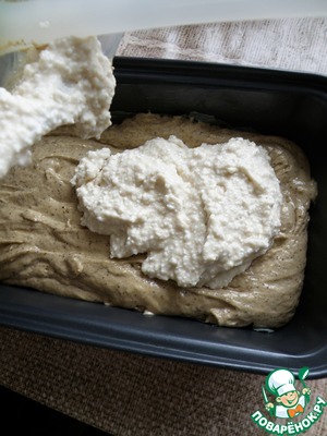 Вылить тесто в подготовленную прямоугольную форму для кекса. Сверху аккуратно выложить творожную начинку.