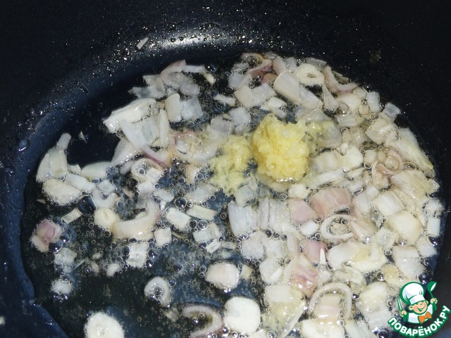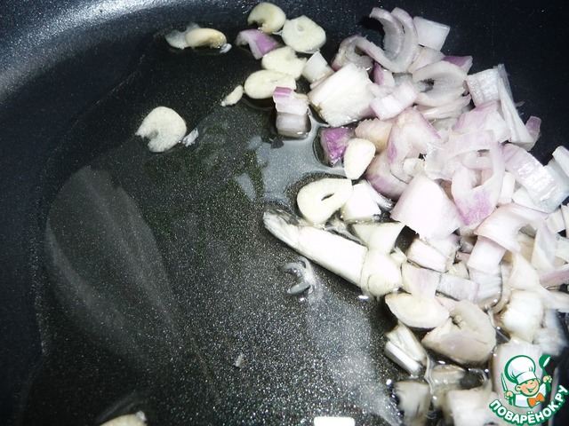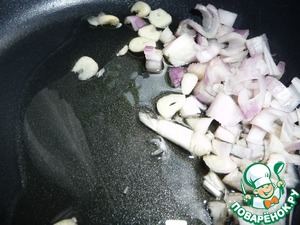 В казанок или кастрюлю с толстым дном налить растительное масло. Измельчить лук и чеснок и слегка обжарить.