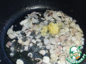 Имбирь натереть на терке и добавить к луку, слегка обжарить.