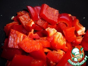 Перец добавить к луку в казанок, перемешать, продолжаем обжаривать коротко.