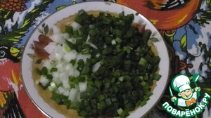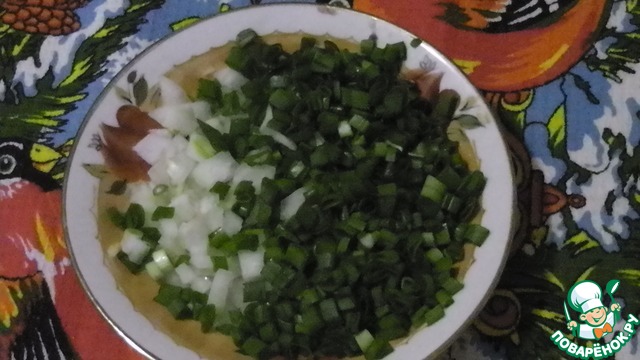 Нарезаем небольшую головку репчатого и пучок зелёного лука.
