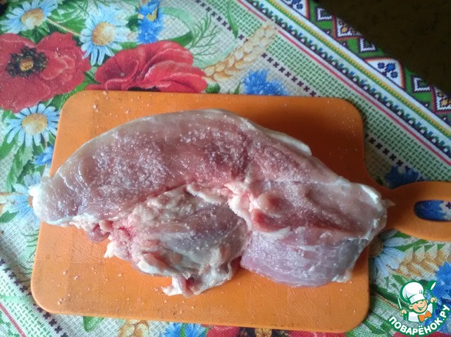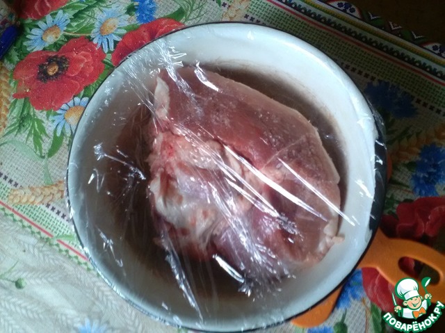 Надо взять кусок свинины (окорок) без костей с небольшими остатками жирка. Промыть его и хорошенько обсушить на бумажном полотенце. Затем засолить. Втереть около чайной ложки «с горкой» соли на килограмм мяса. Лучше всего брать крупную «каменную» помолотую соль, но можно готовую мелкую. Крайне нежелательно использовать морскую соль – от нее может появиться горечь. Положить в чашку и прикрыть. Гнет не нужен, а то продукт получиться суховатый. Засол происходит при температуре примерно +6 градусов (на нижней полке холодильника). Длится засол для куска около 1,5кг трое суток. За это время надо два раза перевернуть кусок, чтобы нижняя и верхняя часть находились при одинаковой влажности (из мяса в процессе засолки выделяется немного рассола).