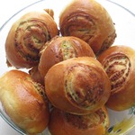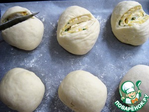 Получившуюся заготовку выложить на противень. Швы остаются по бокам - как резали рулет, так и выкладываем заготовки. У меня поместилось 9 булочек на одном противне.