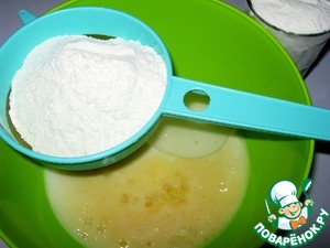 Влить половину яйца. Половину я оставила для смазки. Ввести просеянную муку.