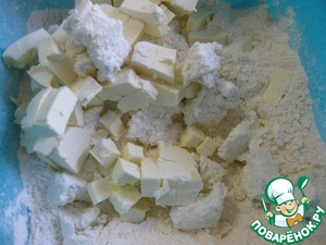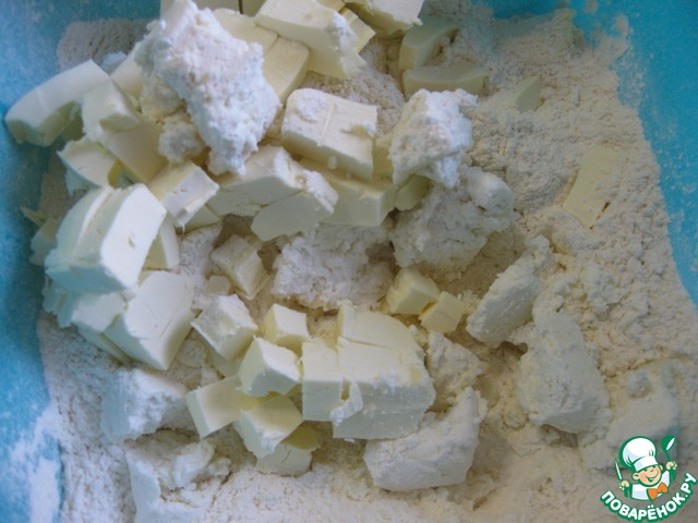 Сначала приготовим тесто, - замешивается оно примерно как песочное, в миску просеиваем муку, нарезаем кубиками масло, добавляем творог и ванильный сахар