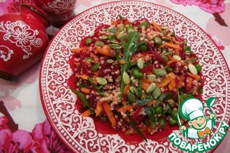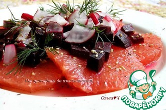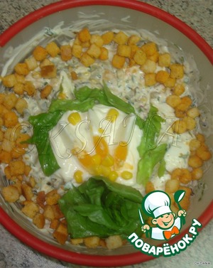 В связи с тем, что захотелось красной икры (но её при этом не оказалось под рукой), был придуман этот салат. По счастью были сухарики с запахом красной икорки, которые оказались, как палочка-выручалочка.