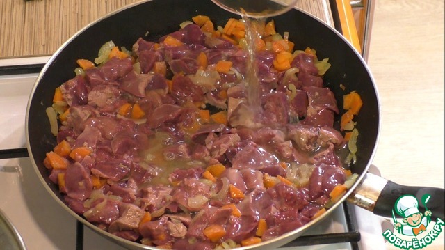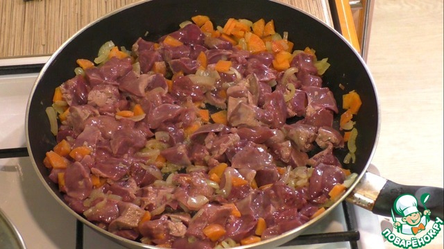 3. На хорошо разогретой сковороде с растительным маслом обжарьте овощи и добавьте к ним куриную печень. Прожарьте минуты 2-3.